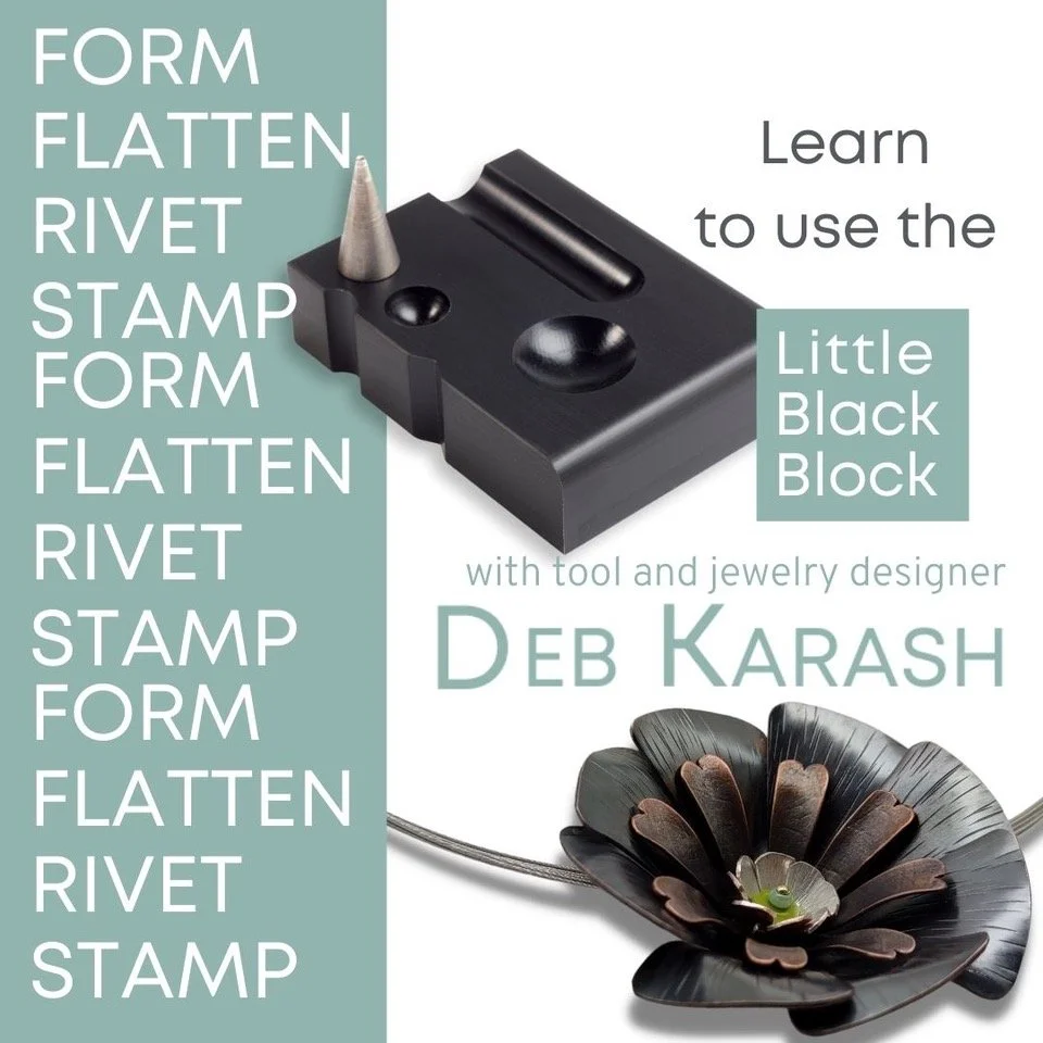 Join us at Ignite March 13th 6-9pm where jeweler and designer, Deb Karash, will teach you a variety of techniques on her Little Black Block including rivets, stamping, forming, and more! This unique tool was designed specifically to help you create dimensional jewelry pieces using cold connections. It's perfect for the home studio where torches are not an option. Plus this tool can replace a variety of traditionally expensive tools all in one affordable package. (Option to purchase set at class.)