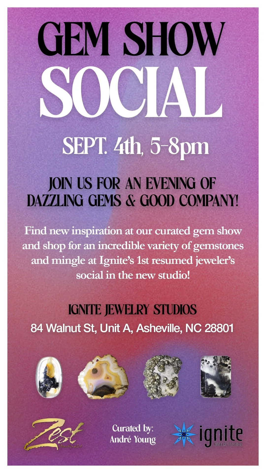 We are so happy to resume Ignite’s Social Nights at the new downtown location of Ignite Jewelry Studios! And the get it going with a bang we are co-hosting a GEM SHOW with Zest Jewelry. The collection will be curated by jewelry artist Andre Young. Come shop from hundreds of unique and one-of-a-kind stones. Or just swing by and be “social” !