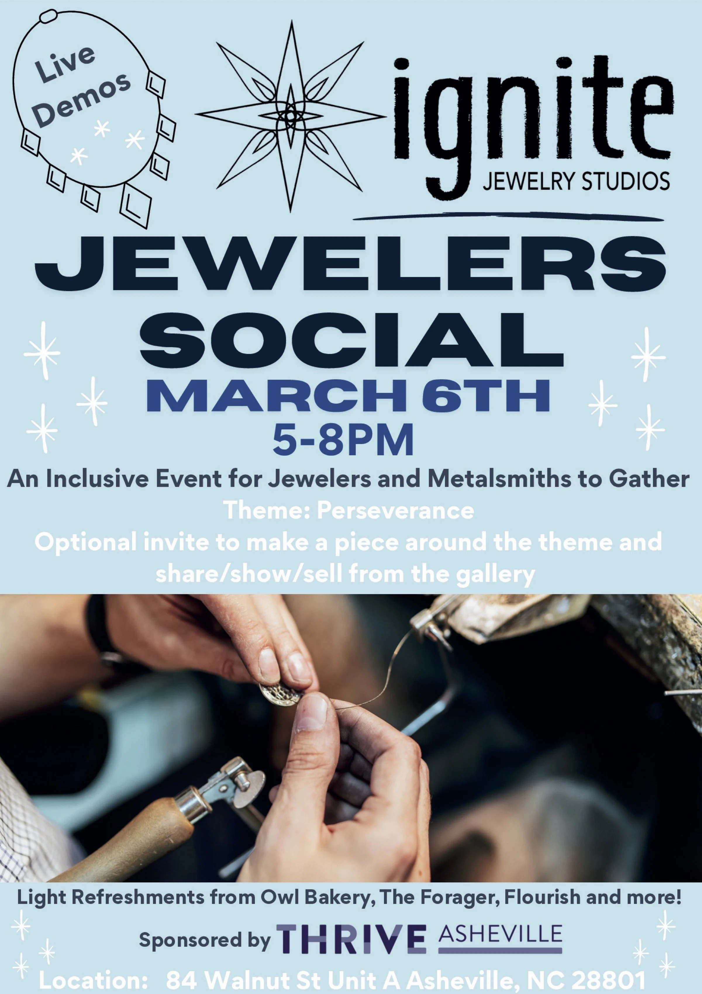 Open to all jewelers! Join us for this fun social celebration of us, and connect with others in the field. This is the first resumed “Social” since Ignite Jewelry Studios re-opened in downtown post flood. Thrive Asheville provided a grant to enhance the event and GoLocal is also a collaborator! Thanks to them there will be extra tasty refreshments as well as live demos and more! All are welcome from the field, including leaders. Come mingle with others in the greater Asheville area jewelry making community!